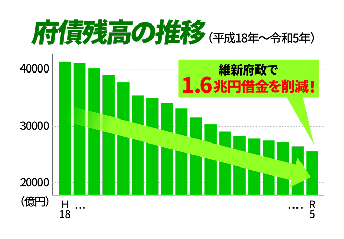安易な増税や超過課税に頼らず、支出の見直し等で財源を生み出し、1.6兆円もの借金削減を達成しました。