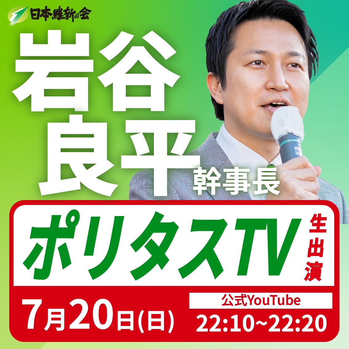 ニュース シェアする ツイートする 2025.07.20出演情報 【ポリタスTV】岩谷良平 幹事長(大阪13区衆議院議員) 番組生出演のお知らせ ━━━━【出演情報】━━━━ 日 時:令和7年7月20日(日) 22:10~22:20 放 送:YouTube 番組名:ポリタスTV テーマ:各政党による参議院選挙の総括および今後の政治活動方針について 是非ご視聴ください! 前へ 次へ