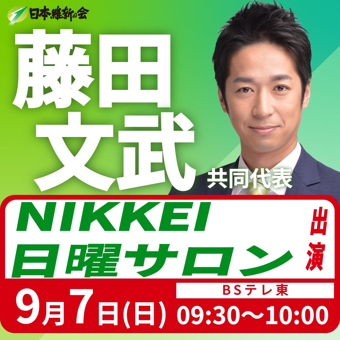 【NIKKEI日曜サロン】藤田文武 日本維新の会共同代表(大阪12区衆議院議員) 番組出演のお知らせ