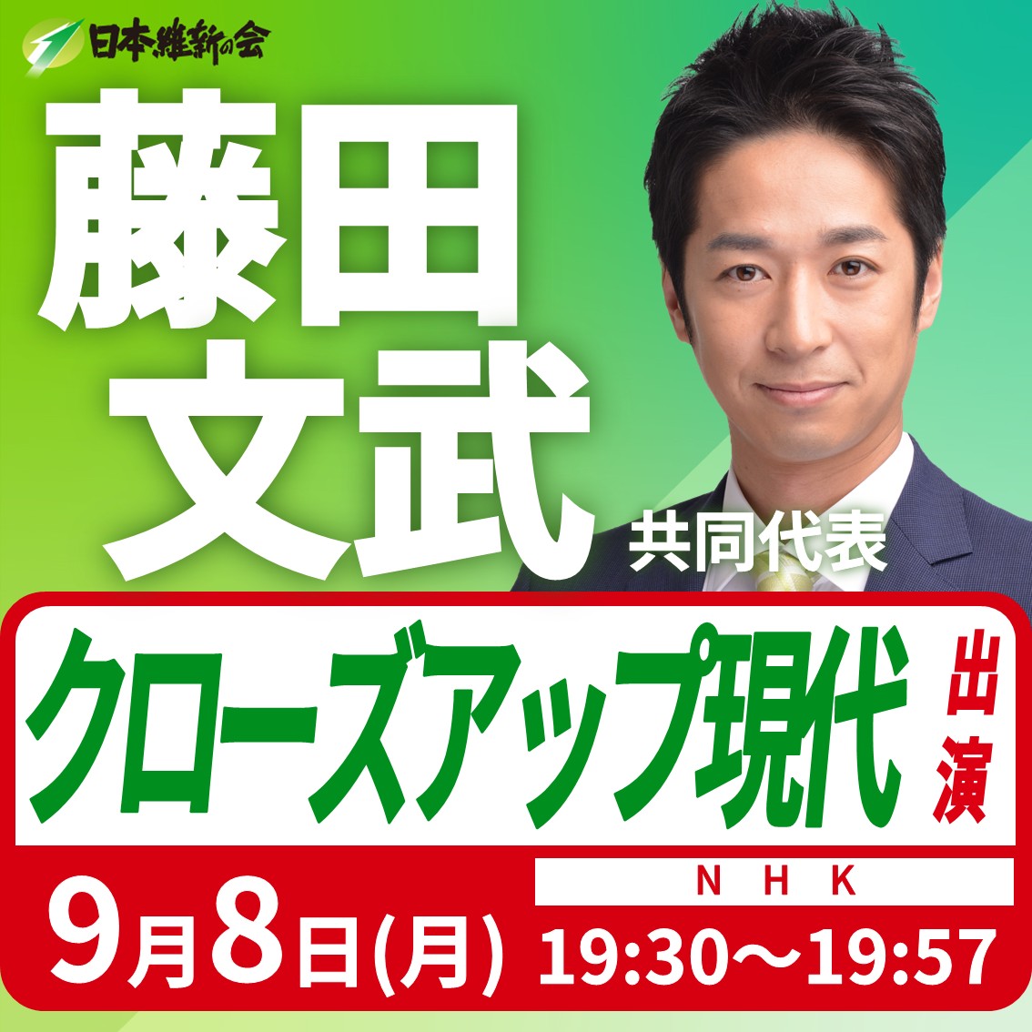 ニュース シェアする ツイートする 2025.09.08出演情報 【 クローズアップ現代 】藤田文武 日本維新の会共同代表(大阪12区衆議院議員) 番組出演のお知らせ ━━━━【出演情報】━━━━ 藤田文武 共同代表 番組出演のお知らせ 日 時:令和7年9月8日(月) 19:30~19:57 放 送:NHK 番組名:クローズアップ現代 テーマ:石破首相辞任表明 政治はどう動く ぜひご視聴ください! 前へ 次へ