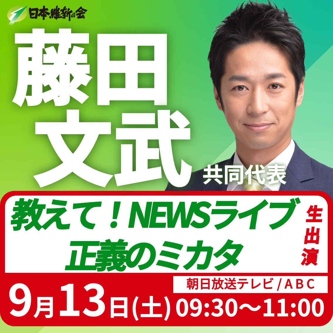 【教えて!NEWSライブ 正義のミカタ】藤田文武 日本維新の会共同代表(大阪12区衆議院議員)番組生出演のお知らせ