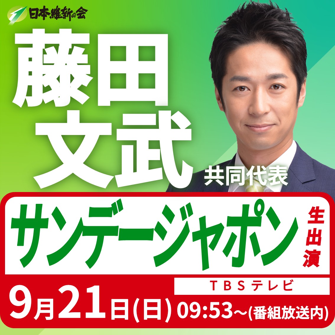 ニュース シェアする ツイートする 2025.09.21出演情報 【サンデージャポン】藤田文武 日本維新の会共同代表(大阪12区衆議院議員)番組生出演のお知らせ ━━━━【出演情報】━━━━ 藤田文武 日本維新の会共同代表(大阪12区衆議院議員) 番組生出演のお知らせ 日 時:令和7年9月21日(日) 09:53~(番組放送内に出演) 放 送:TBSテレビ 番組名:サンデージャポン 是非ご視聴ください! 前へ 次へ