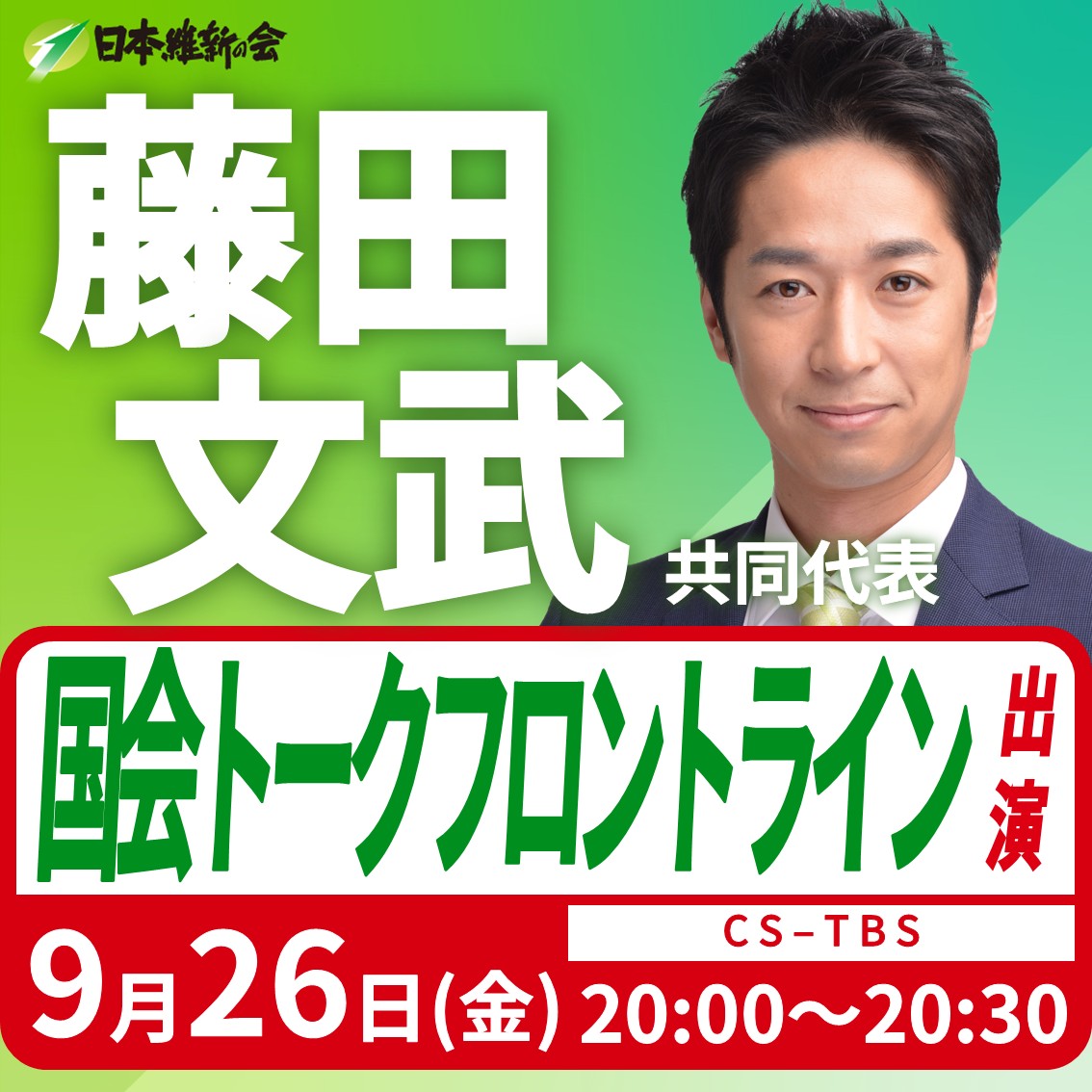 【国会トークフロントライン】藤田文武 日本維新の会共同代表(大阪12区衆議院議員)番組出演のお知らせ