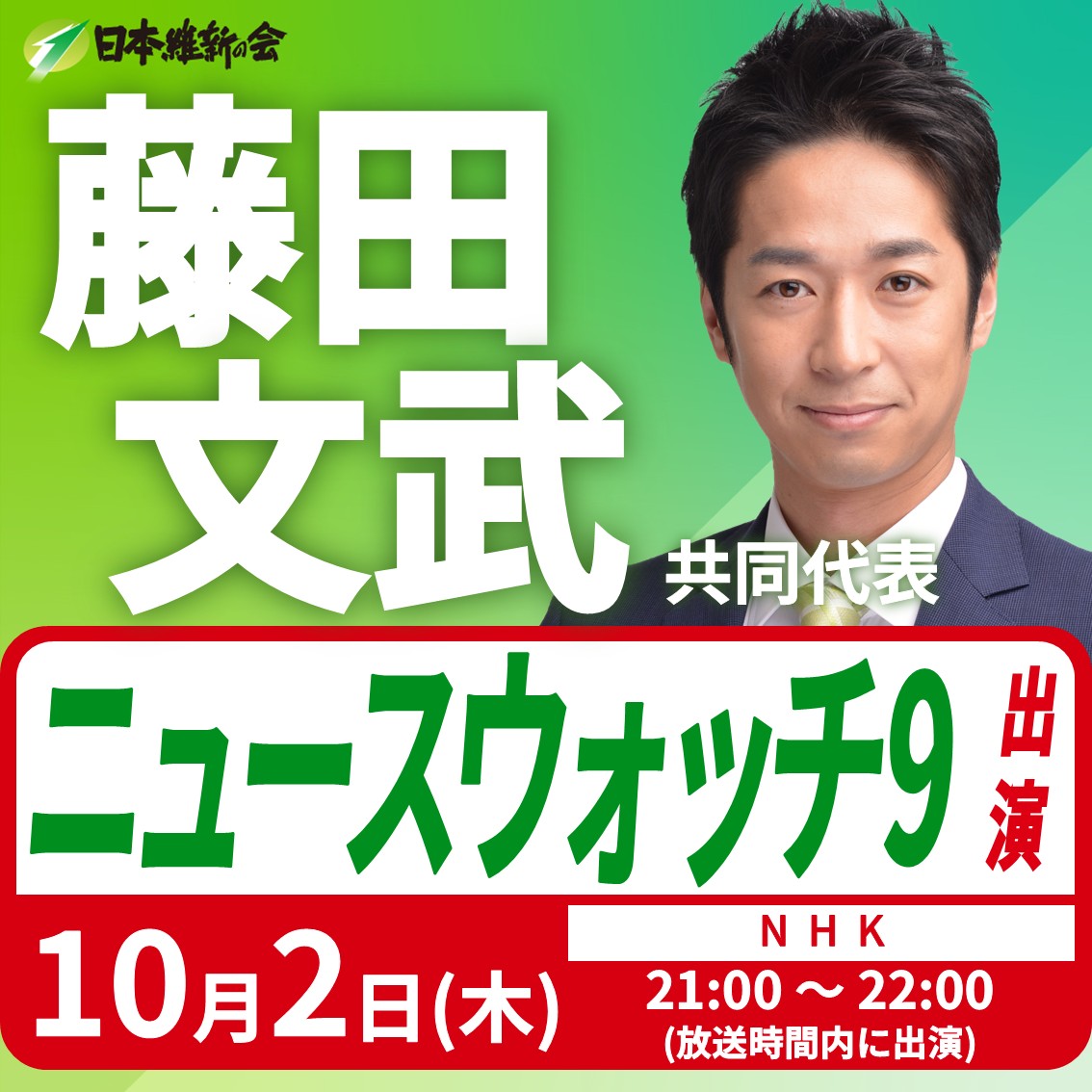 【ニュースウォッチ9】藤田文武 日本維新の会共同代表(大阪12区衆議院議員)番組出演のお知らせ