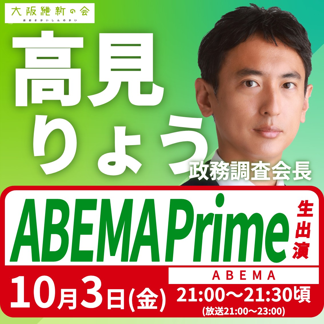 【ABEMA Prime】高見りょう 政務調査会長 番組生出演(リモート)のお知らせ