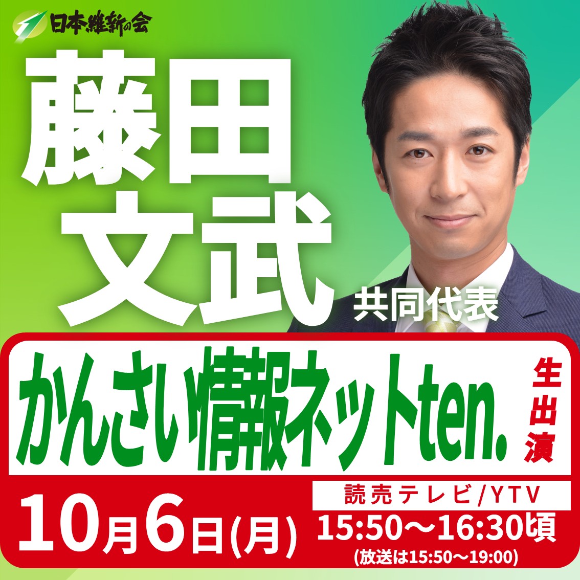 【かんさい情報ネットten.】藤田文武 日本維新の会共同代表(大阪12区衆議院議員)番組生出演のお知らせ