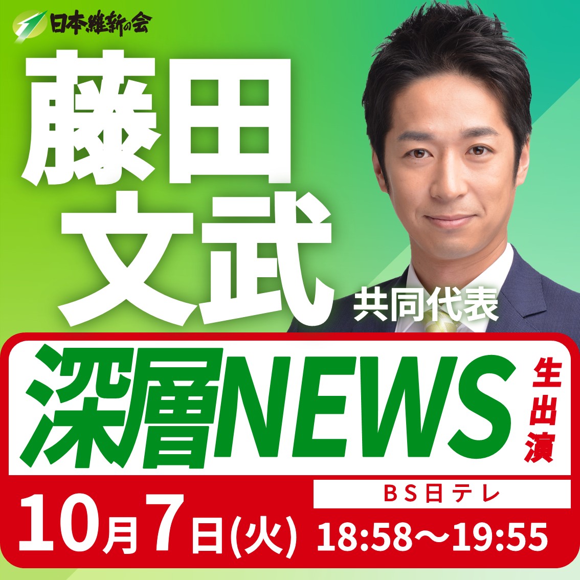 【深層NEWS】藤田文武 日本維新の会共同代表(大阪12区衆議院議員)番組生出演のお知らせ