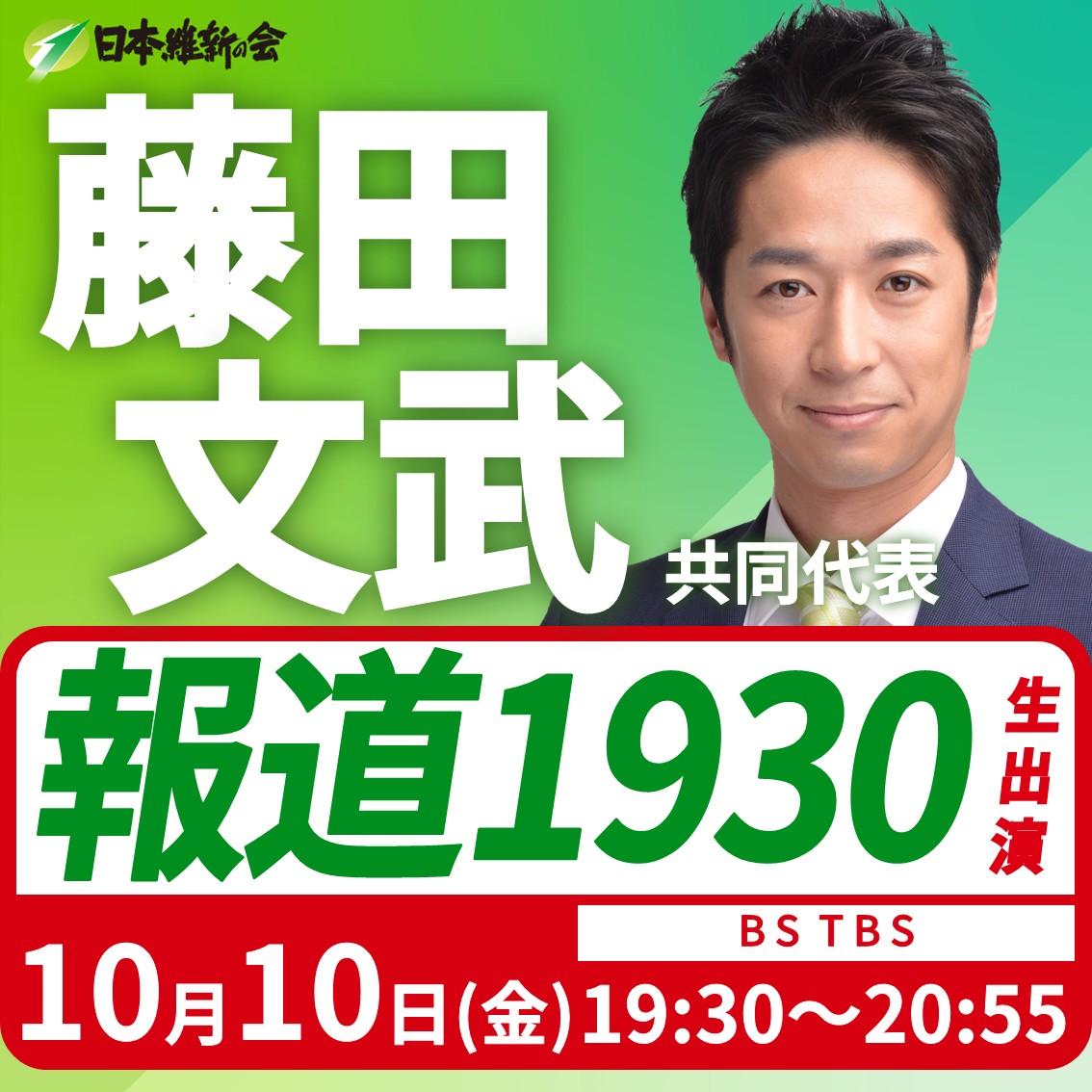 【報道1930】藤田文武 日本維新の会共同代表(大阪12区衆議院議員)番組生出演のお知らせ