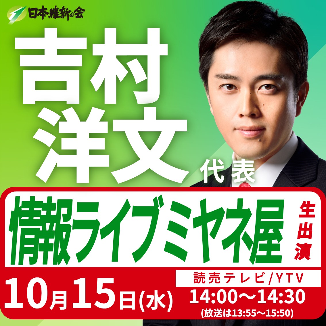 吉村洋文 日本維新の会代表(大阪維新の会代表)番組生出演のお知らせ