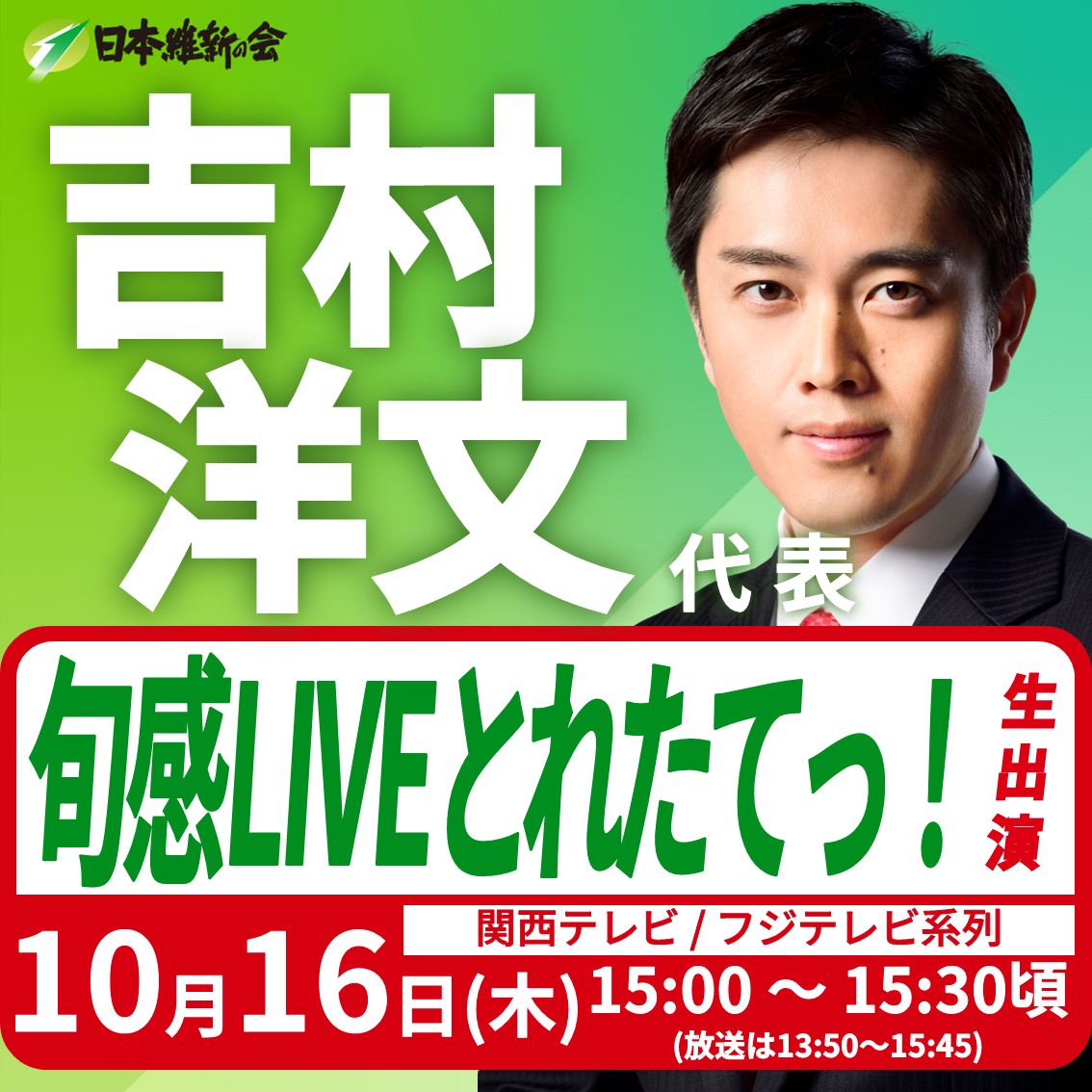 【旬感LIVE とれたてっ!】吉村洋文 日本維新の会代表(大阪維新の会代表)番組生出演のお知らせ