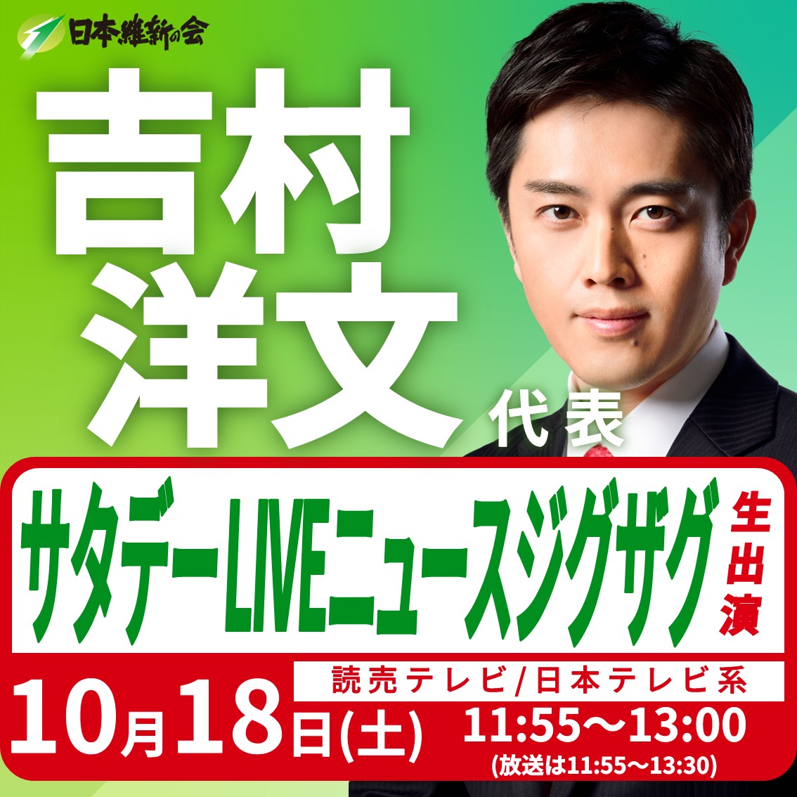 【サタデーLIVE ニュース ジグザグ】吉村洋文 日本維新の会代表(大阪維新の会代表)番組生出演のお知らせ