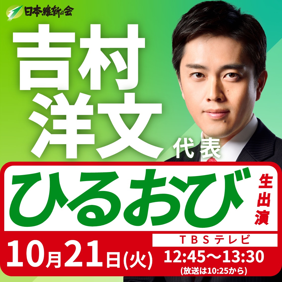 ニュース シェアする ツイートする 2025.10.21出演情報 【ひるおび】吉村洋文 日本維新の会代表(大阪維新の会代表)番組生出演のお知らせ ━━━━【出演情報】━━━━ 吉村洋文 日本維新の会代表(大阪維新の会代表)番組生出演のお知らせ 日 時:令和7年10月21日(火) 12:45~13:30(放送は10:25~) 放 送:TBSテレビ 番組名:ひるおび 是非ご視聴ください! 前へ 次へ