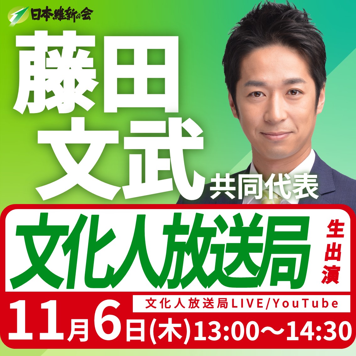 ニュース シェアする ツイートする 2025.11.06出演情報 【文化人放送局】藤田文武 日本維新の会共同代表(大阪12区衆議院議員)ラジオ番組生出演のお知らせ ━━━━【出演情報】━━━━ 藤田文武 日本維新の会共同代表(大阪12区衆議院議員)ラジオ番組生出演のお知らせ 日 時:令和7年11月6日(木) 13:00~14:30 配 信:YouTube 番組名:文化人放送局LIVE 是非ご視聴ください! 前へ 次へ