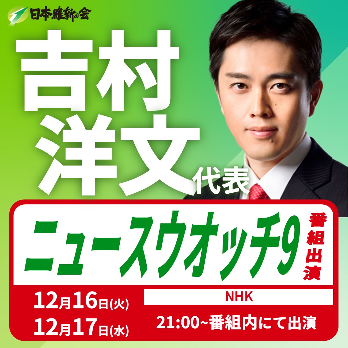 ニュース シェアする ツイートする 2025.12.16出演情報 【ニュースウォッチ9】吉村洋文 日本維新の会代表(大阪維新の会代表)番組生出演のお知らせ ━━━━【出演情報】━━━━ 吉村洋文 日本維新の会 代表(大阪維新の会 代表) 番組出演のお知らせ 日 時:令和7年12月16日(火)・12月17日(水) 21:00~番組内で出演 放 送:NHK 番組名:ニュースウォッチ9 ぜひご視聴ください! 前へ 次へ