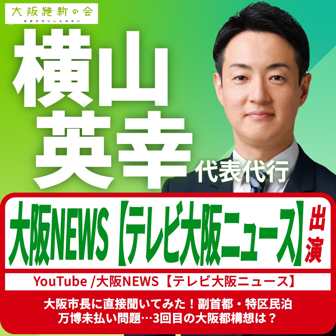 【大阪NEWS テレビ大阪ニュース】横山英幸 代表代行 YouTube番組出演のお知らせ