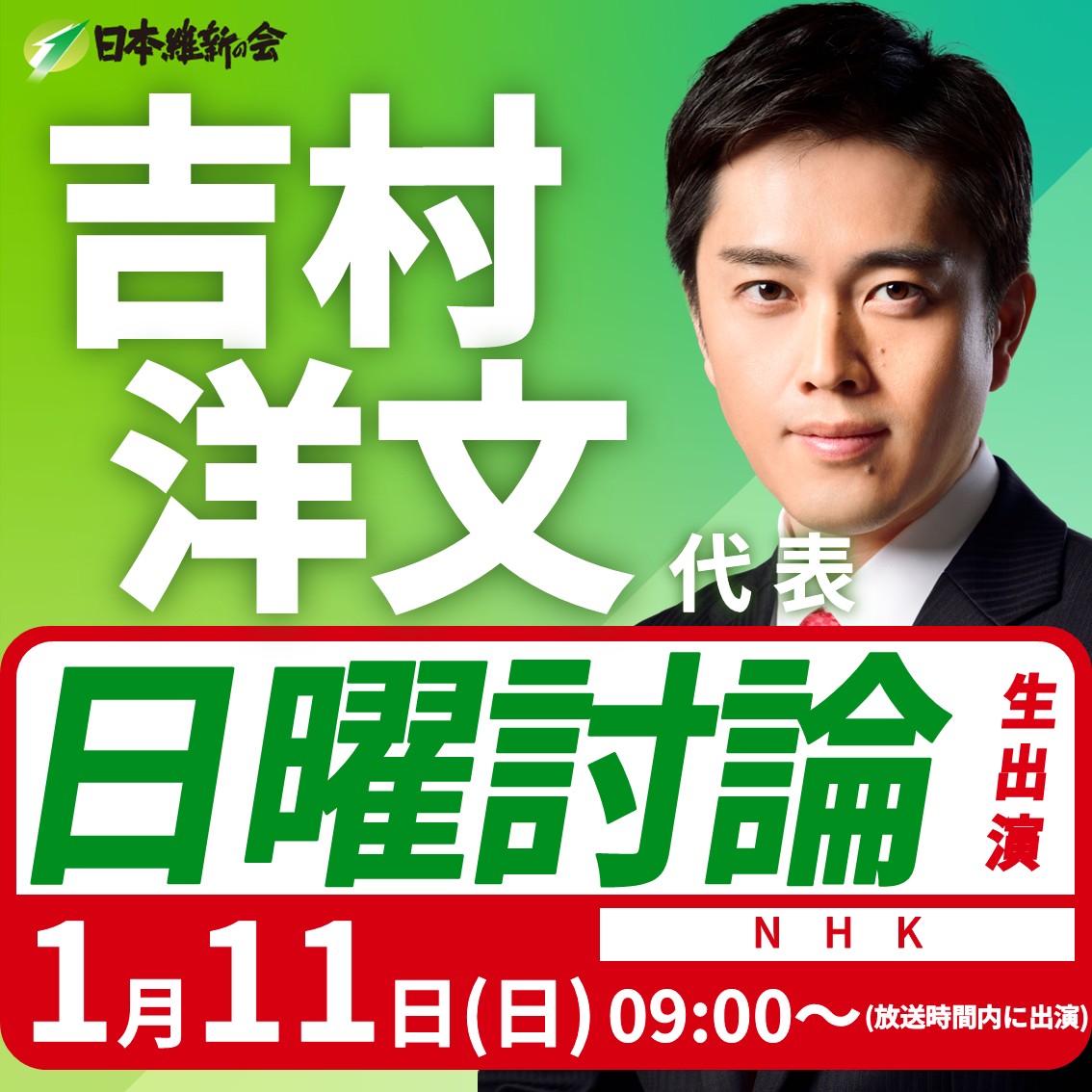 ニュース シェアする ツイートする 2026.01.11出演情報 【日曜討論】吉村洋文 日本維新の会代表(大阪維新の会代表)番組生出演のお知らせ ━━━━【出演情報】━━━━ 吉村洋文 日本維新の会代表(大阪維新の会代表)番組生出演のお知らせ 日 時:令和8年1月11日(日) 09:00~(放送時間内に出演) 放 送:NHK 番組名:日曜討論 主な内容:各党党首個別インタビュー ぜひご視聴ください! 前へ 次へ