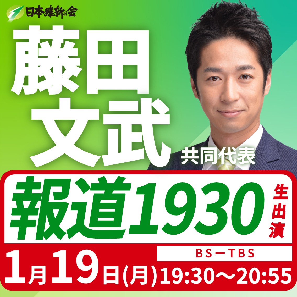 ニュース シェアする ツイートする 2026.01.19出演情報 【報道1930】藤田文武 日本維新の会共同代表(大阪12区衆議院議員)番組生出演のお知らせ ━━━━【出演情報】━━━━ 藤田文武 日本維新の会共同代表(大阪12区衆議院議員)番組生出演のお知らせ 日 時:令和8年1月19日(月) 19:30~20:55 放 送:BS-TBS 番組名:報道1930 ぜひご視聴ください! 前へ 次へ