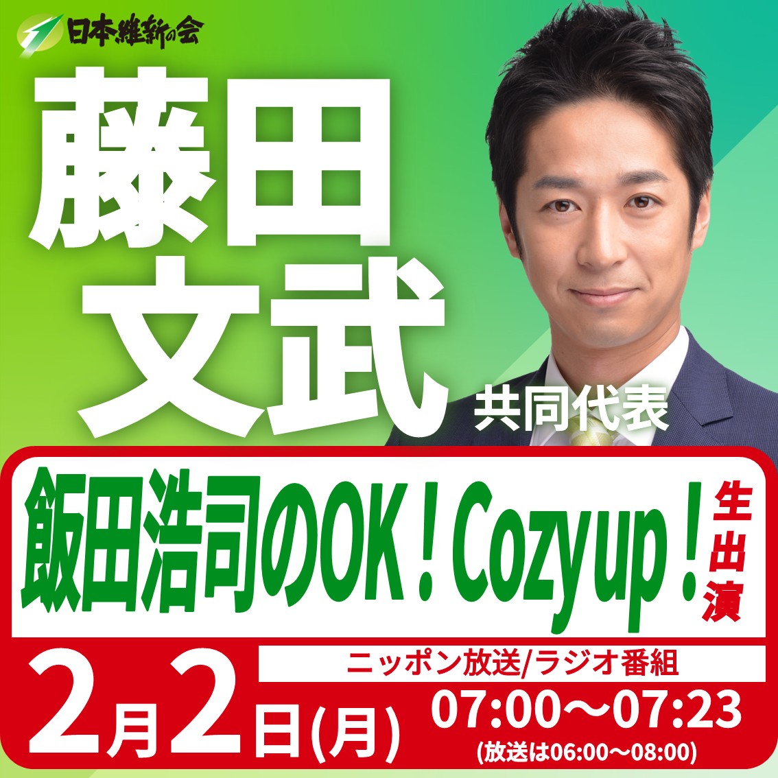 【飯田浩司のOK!Cozy up!】藤田文武 日本維新の会共同代表(衆議院大阪12区候補者)ラジオ番組生出演のお知らせ