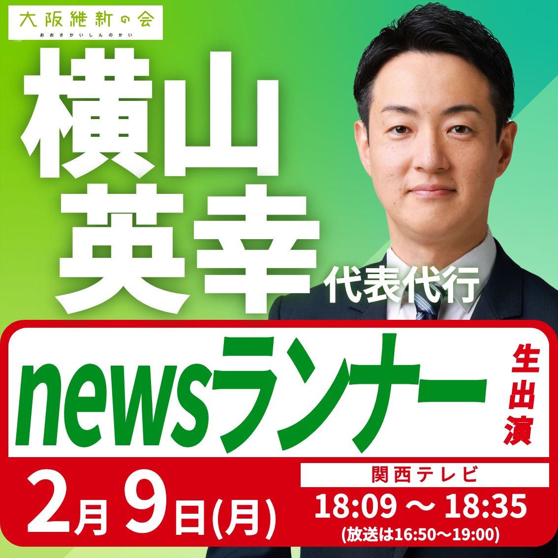 ニュース シェアする ツイートする 2026.02.09出演情報 【newsランナー】横山英幸 代表代行 番組生出演のお知らせ ━━━━【出演情報】━━━━ 横山英幸 代表代行 番組生出演のお知らせ 日 時:令和8年2月9日(月) 18:09~18:35(放送は16:50~19:00) 放 送:関西テレビ 番組名:newsランナー ぜひご視聴ください! 前へ 次へ