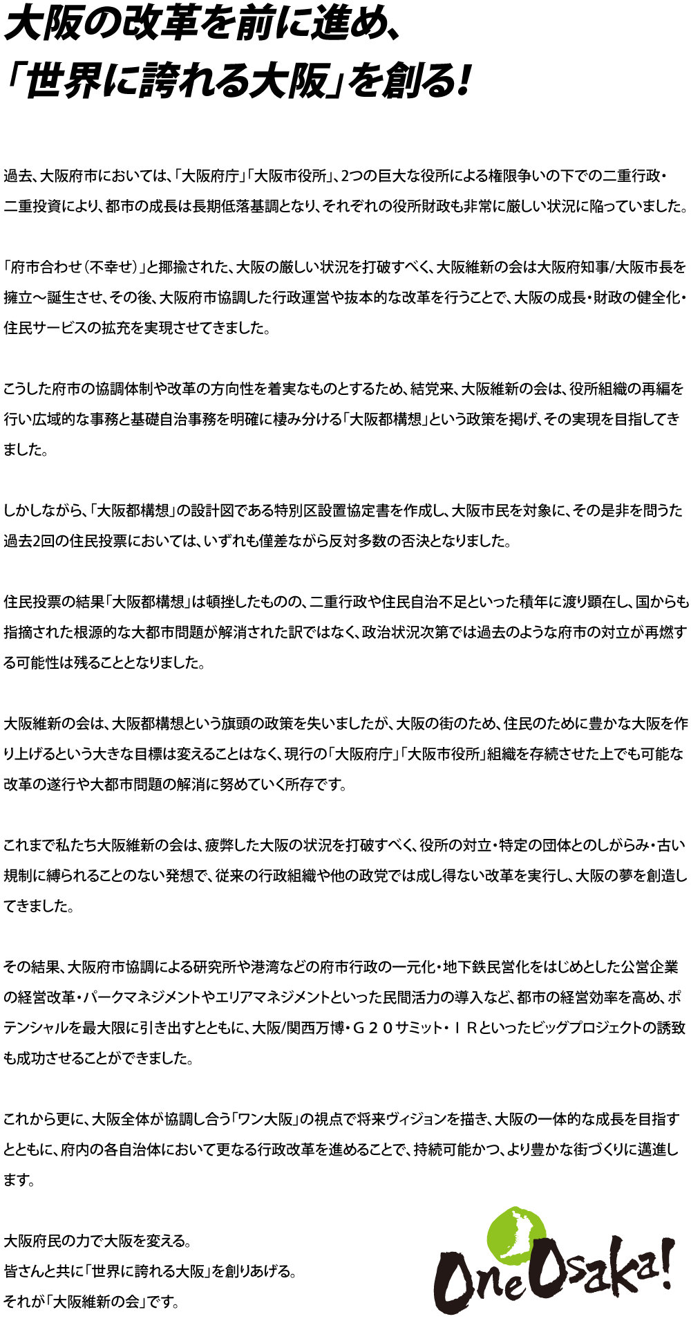 トップ 大阪維新の会とは 綱領 大阪維新の会の綱領をご覧いただけます。 詳しくはこちら 規約 大阪維新の会の規約をご覧いただけます。 詳しくはこちら 設立の趣旨 大阪維新の会設立の趣旨についてご紹介いたします。 詳しくはこちら 寄附のお願い 大阪維新の運営及び活動をサポートしていただける方を募集しています。 詳しくはこちら