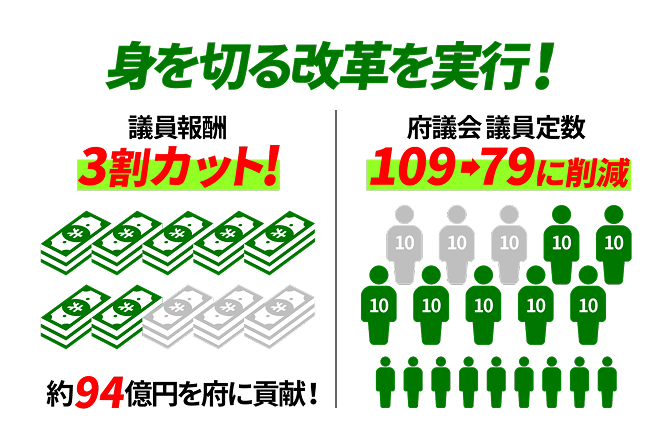 大阪府議会議員報酬を3割カット・議員定数を約3割削減。また、市議会においても定数削減と報酬カットを実施。加えて知事・市長の報酬カットや退職金廃止も行う等、コストカットによる府議団の貢献金額は約94億円に達しています。