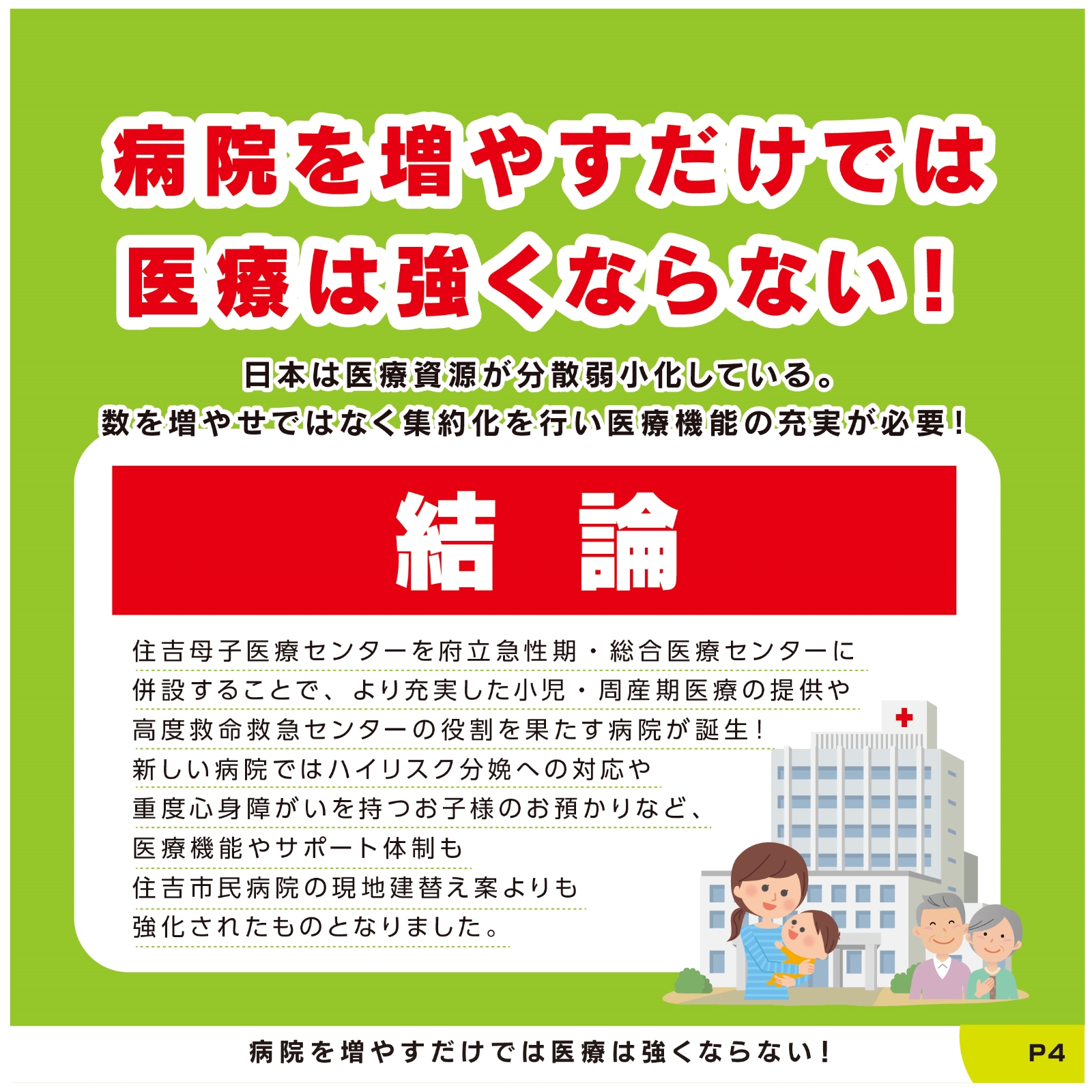 住吉市民病院は築60年以上と老朽化している状態で利用者が減り病床利用率も6割を切るなど病院の状態が悪化していた。そのため、平松市長時代に小児周産期医療に特化した病院になることが決定していた。